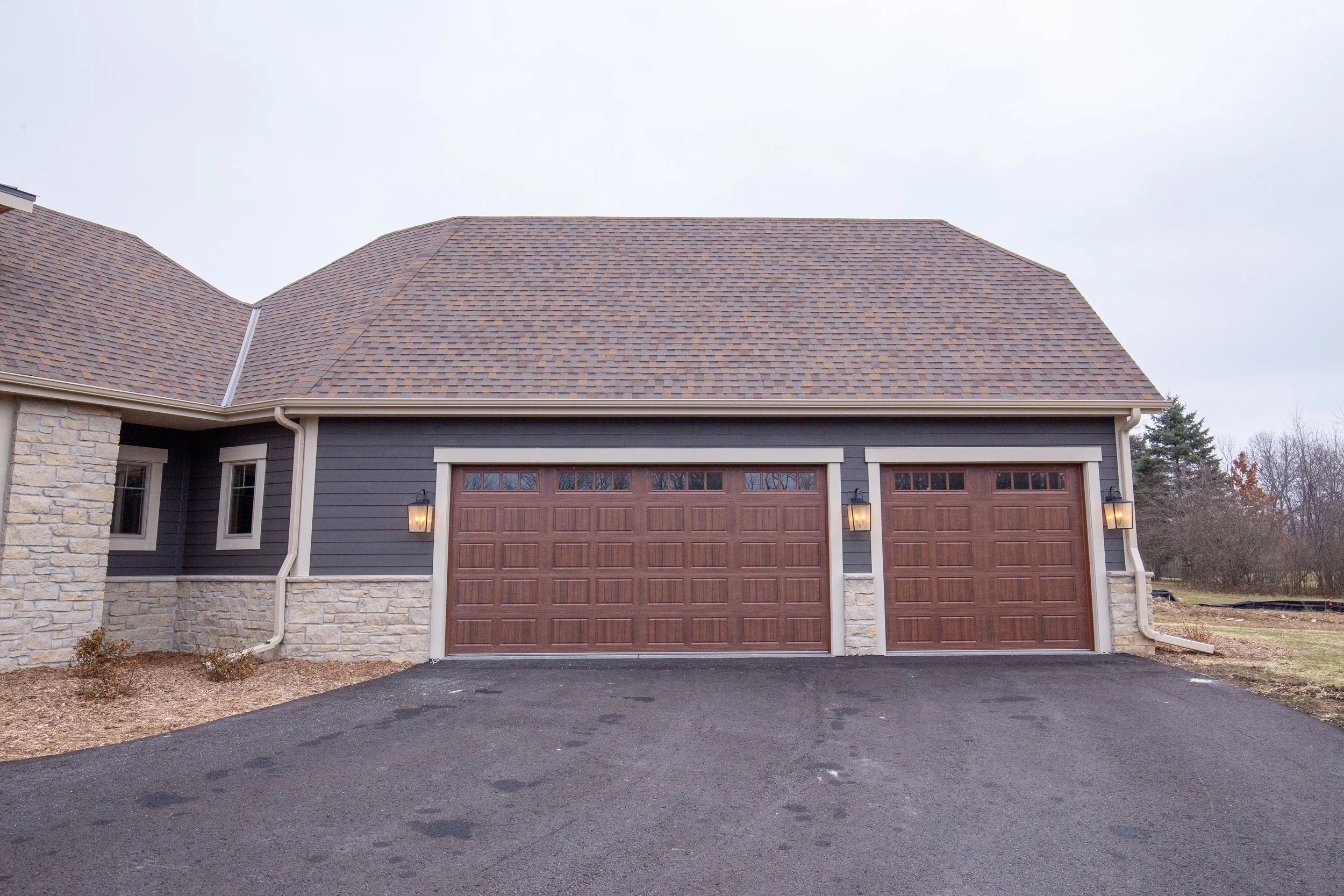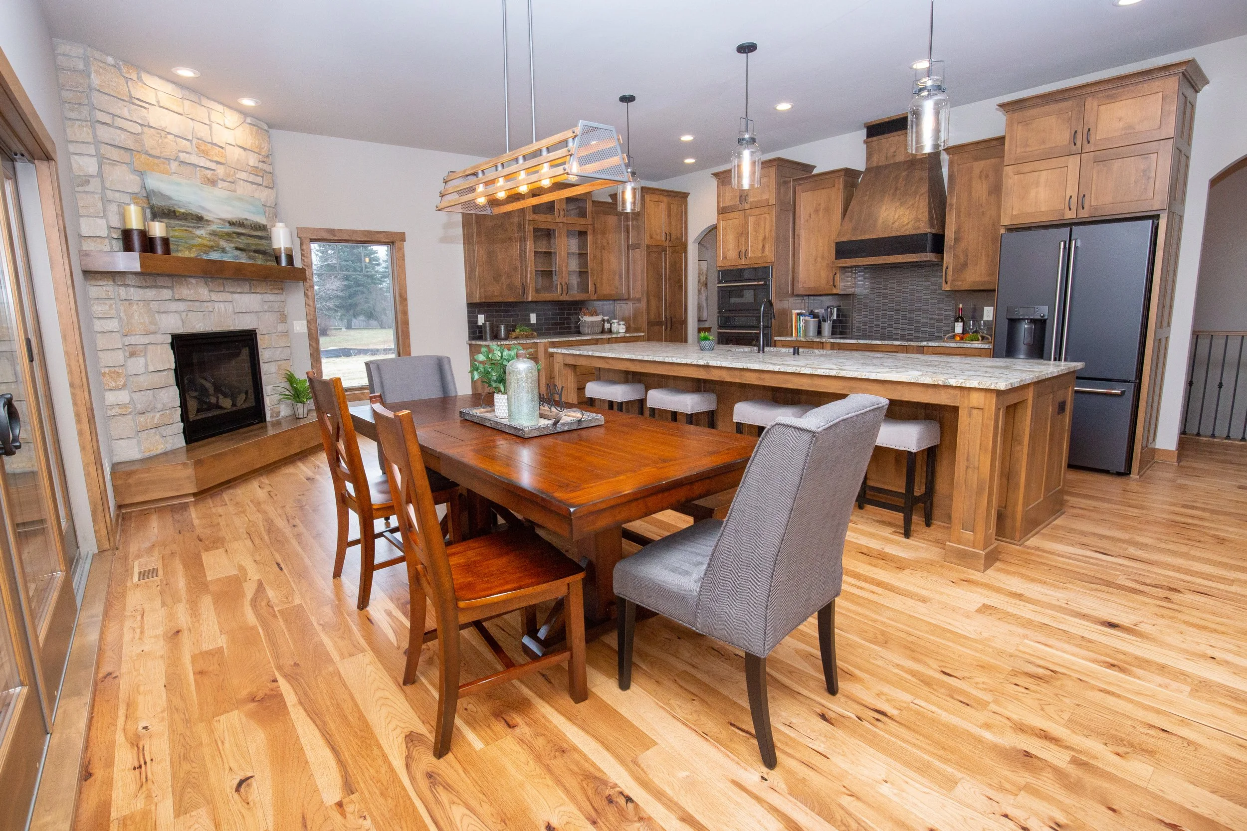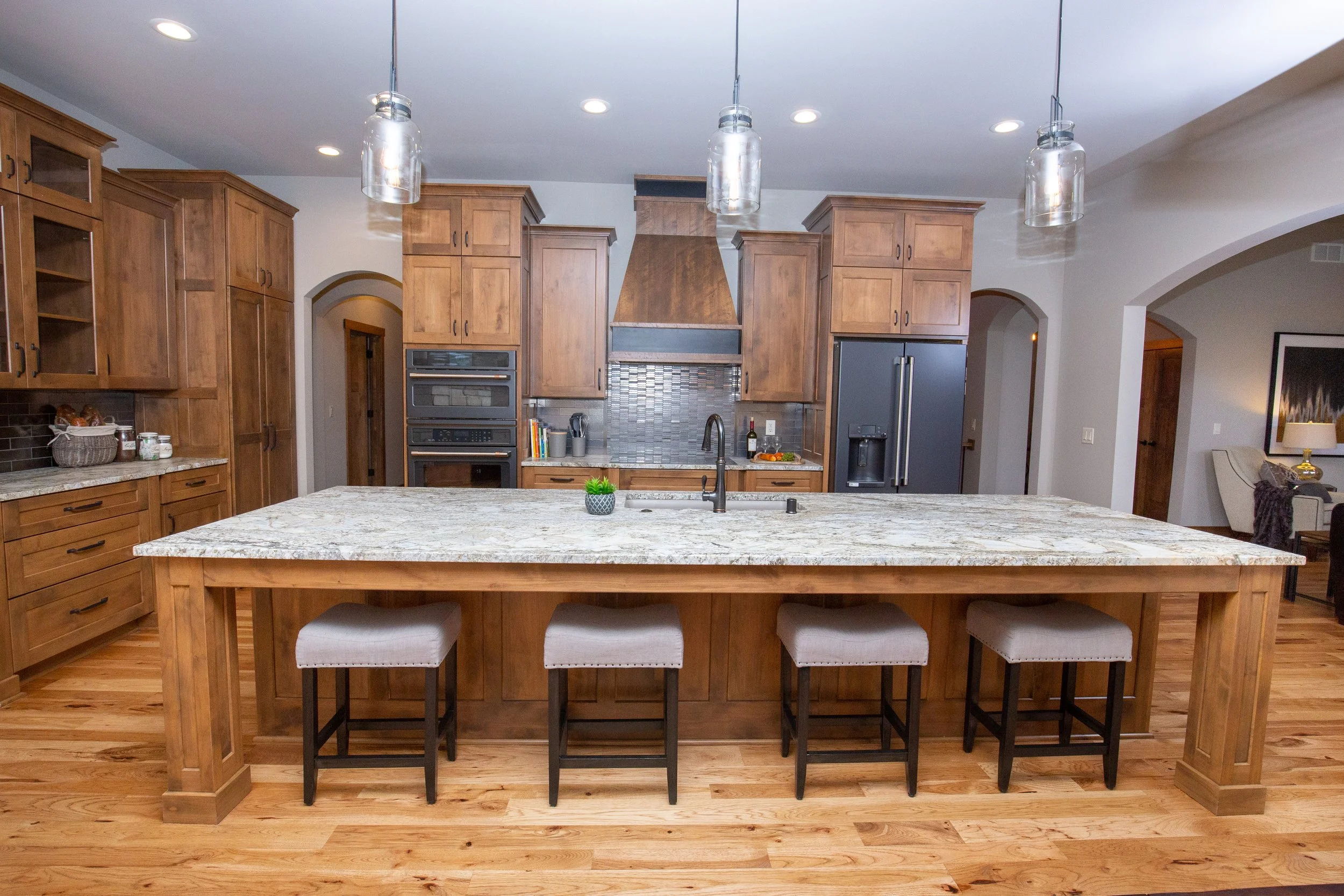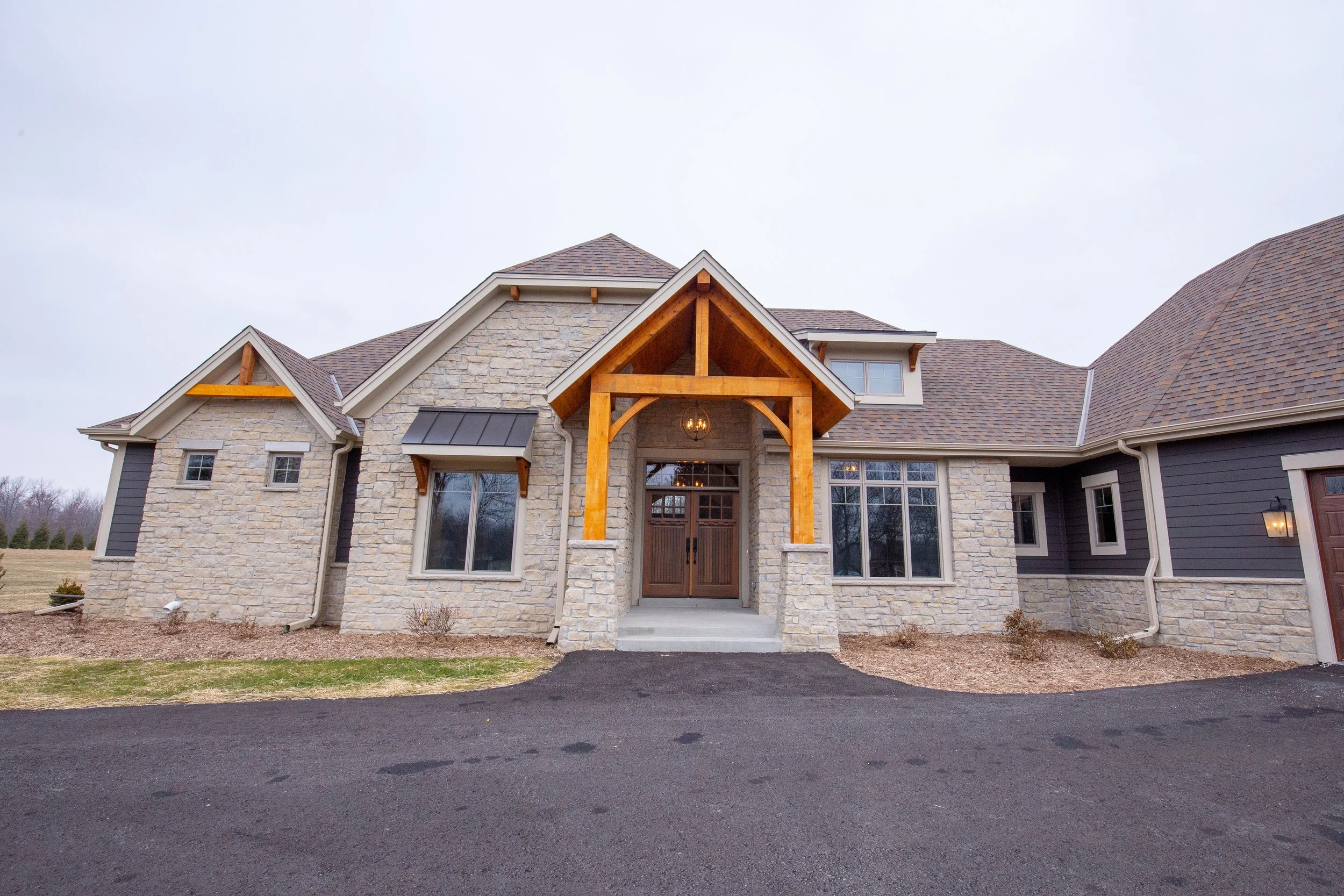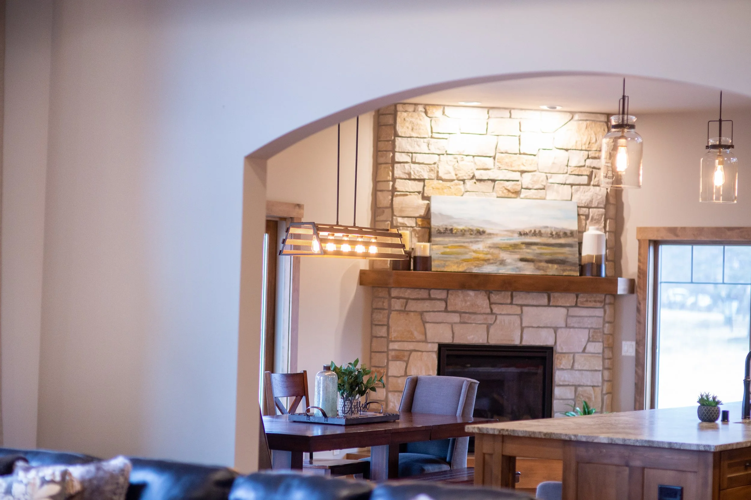 This impressive custom home is a variation on our Aubrey Ranch model. An inviting foyer with stepped ceilings and a custom tile wall is the perfect space to welcome family and friends. A large great room with floor to ceiling windows leads into a spacious kitchen, which is set off by an exquisite island and rich custom cabinetry. More entertaining space is provided by a cozy hearth room enhanced by a wood beam ceiling and stunning fireplace. A luxurious laundry room doubles as a craft space with built-in cabinetry and a large island, ideal for wrapping presents and hobbies! The master suite boasts his and her closets and a glamorous bath with a walk-in shower and double sinks. Two additional bedrooms connected by a Jack and Jill bath offer plenty of additional space for family members or guests.